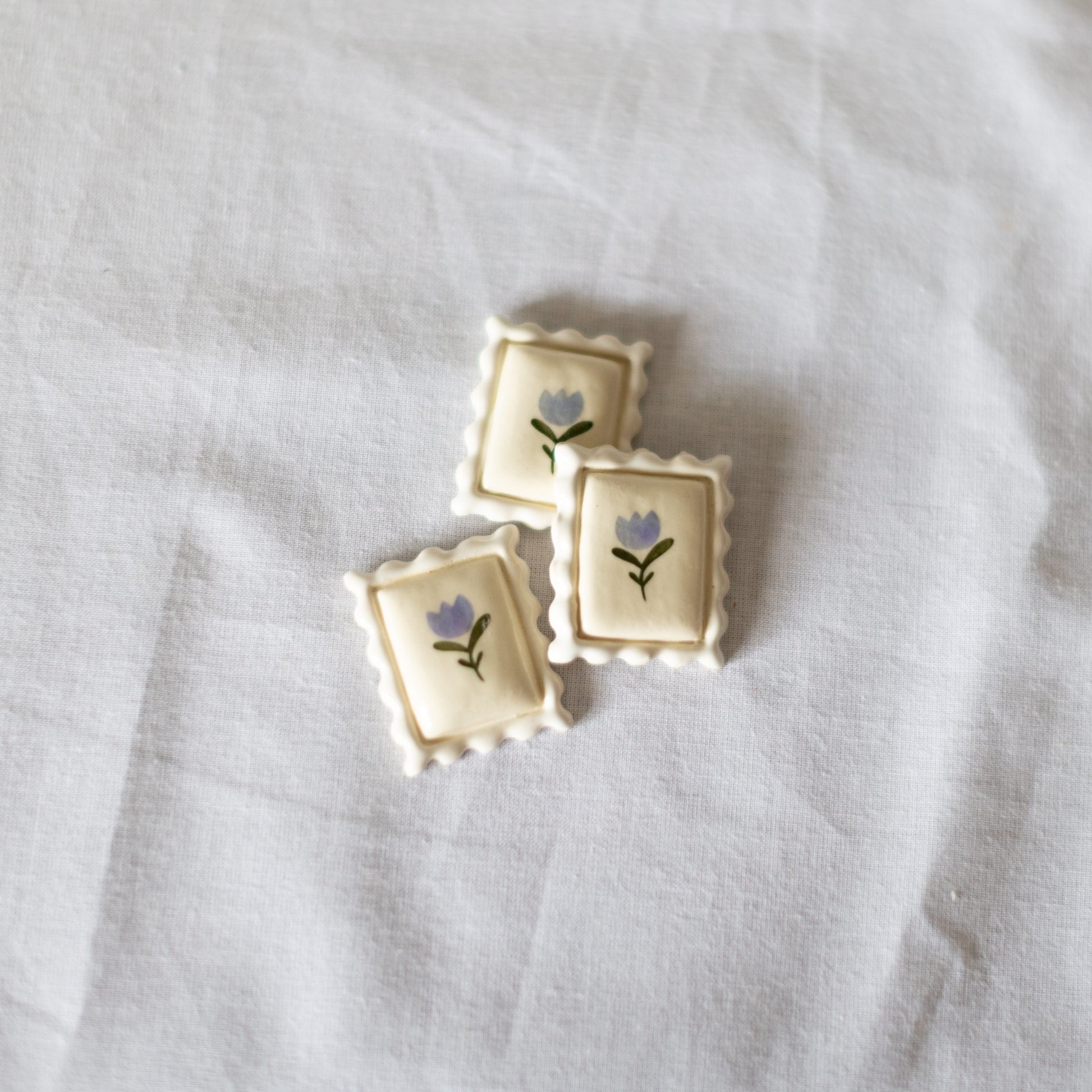 The Floral Postage Stamp Ceramic Magnet is hand-cut from white clay and glazed with a white border, lavender flower, and green stem. Each one is unique, with subtle variations in shape, texture, and color.