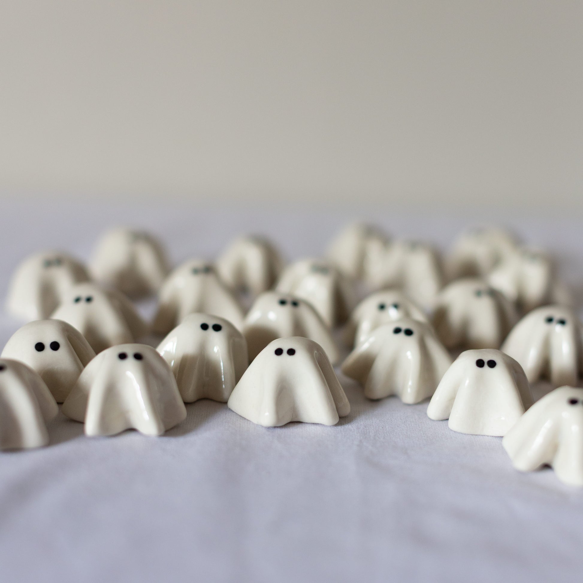 The Mini Porcelain Ghosts are hand-shaped and glazed, the natural color of the porcelain shines through underneath a coat of clear glaze for that shiny finish. Each one is unique, with subtle variations in shape and design.